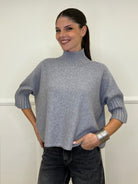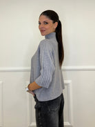 Oversized boxy sweater in stretch viscose, with a dropped volcano neck and 3/4 sleeves. Ribbed trim detail.