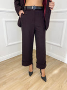 Coordinated high-waisted stretch twill trousers with elastic waistband and belt loops, zip and button closure, and side pockets. Wide turn-up detail at the cuffs and a removable belt included.