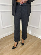 Coordinated high-waisted stretch twill trousers with elastic waistband and belt loops, zip and button closure, and side pockets. Wide turn-up detail at the cuffs and a removable belt included.