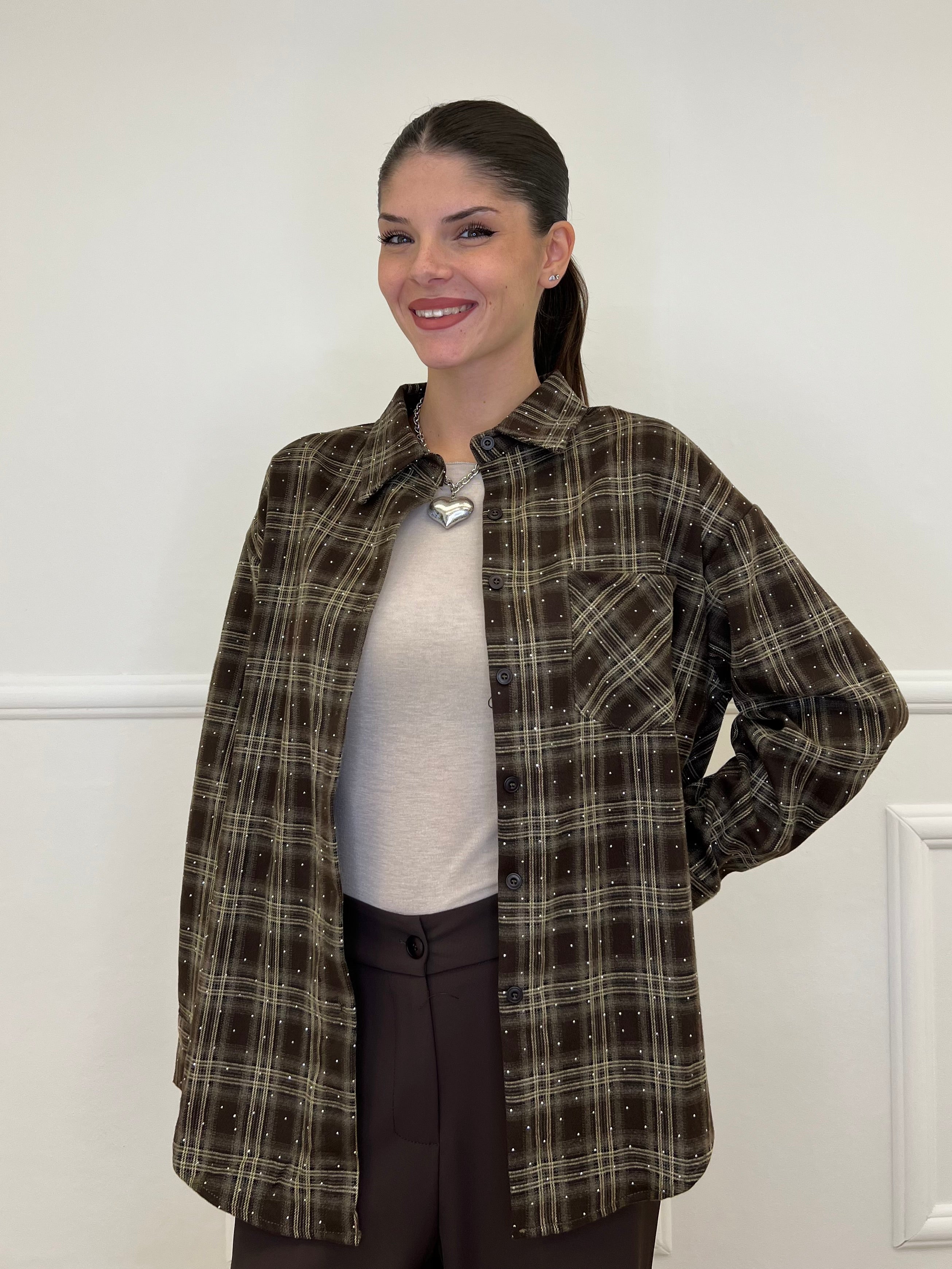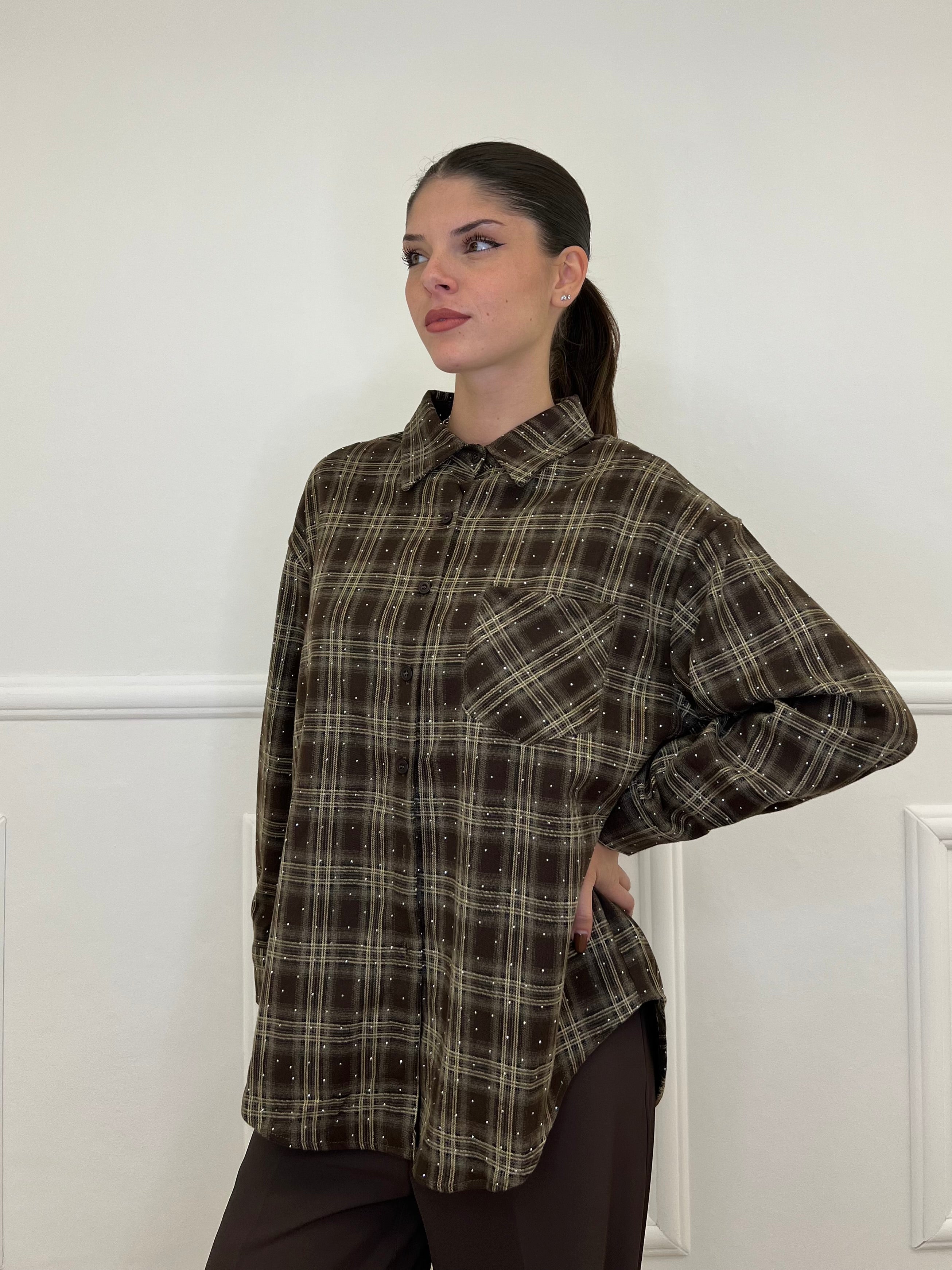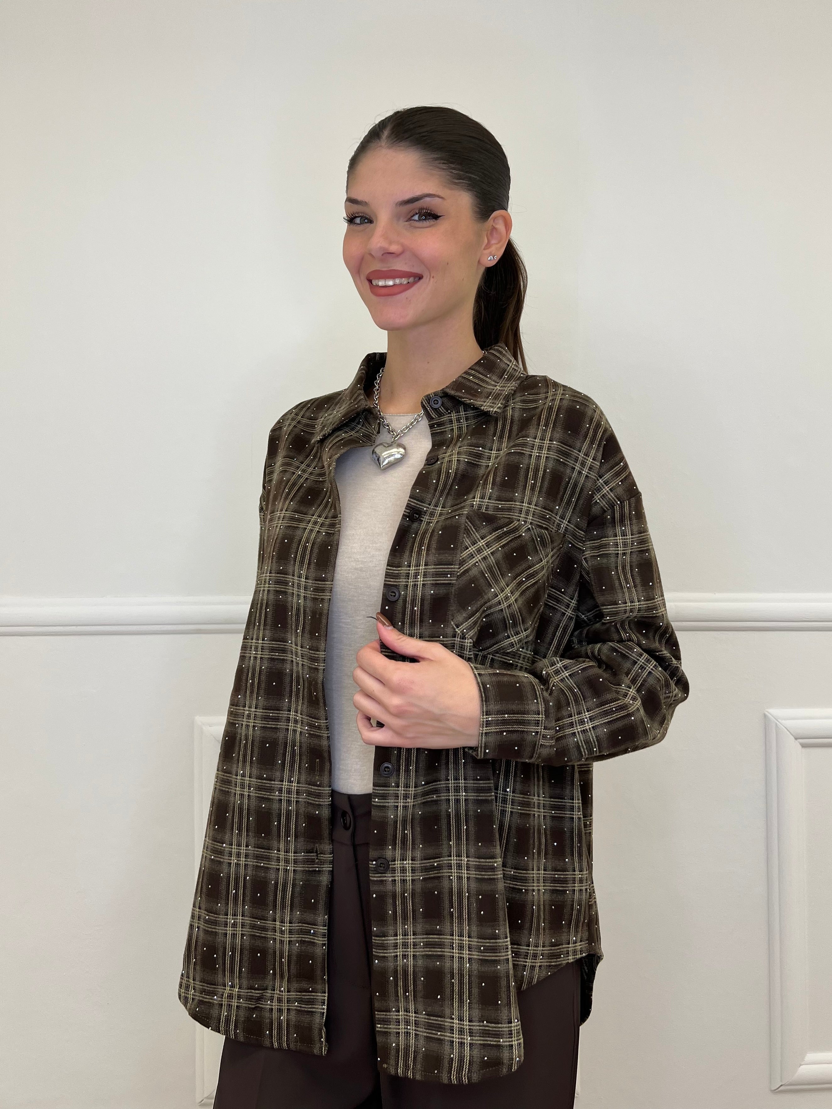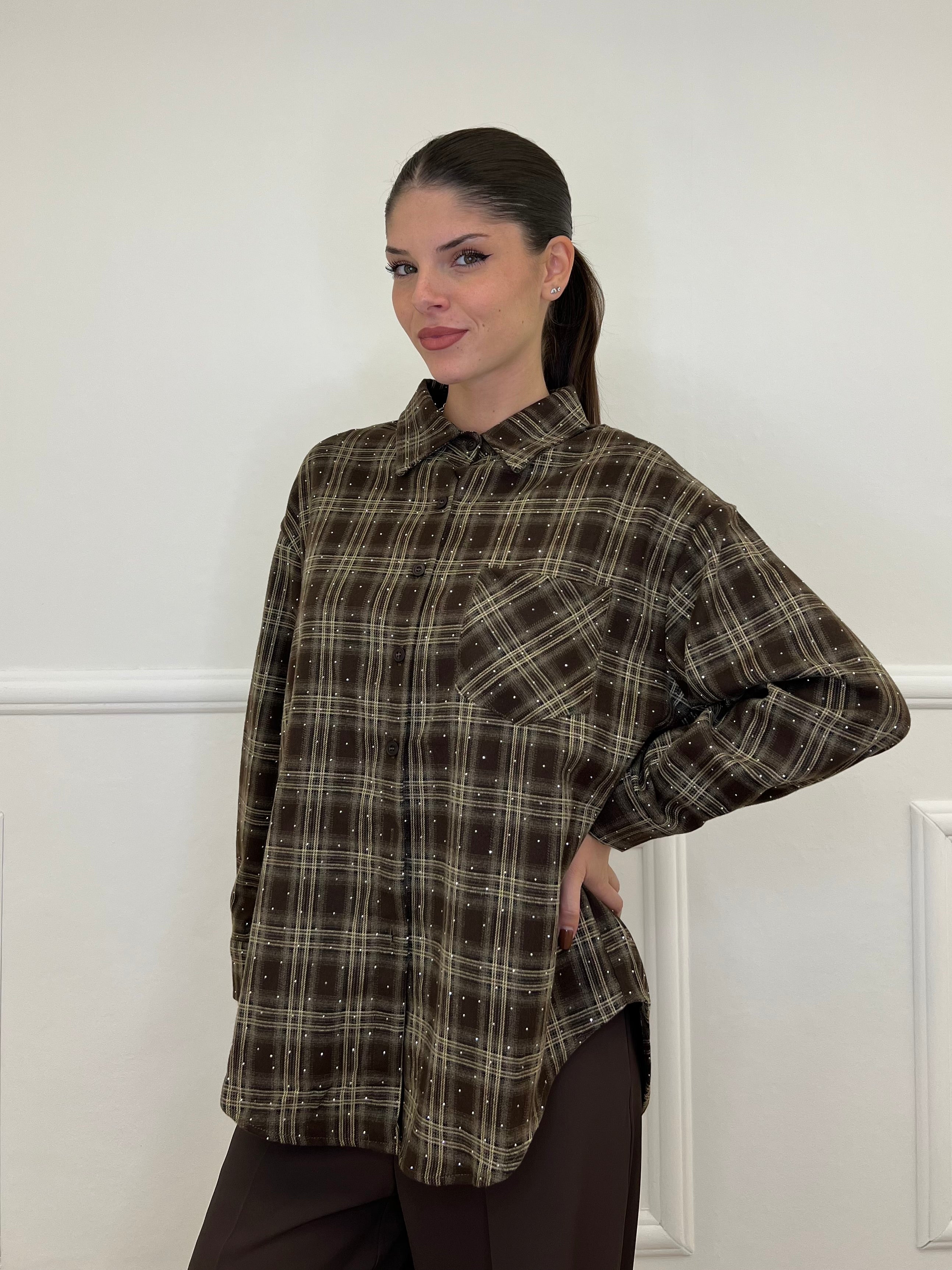 Camicia over in flanella di cotone madras con applicazioni micro strass e taschino frontale.