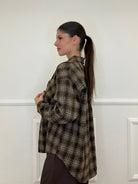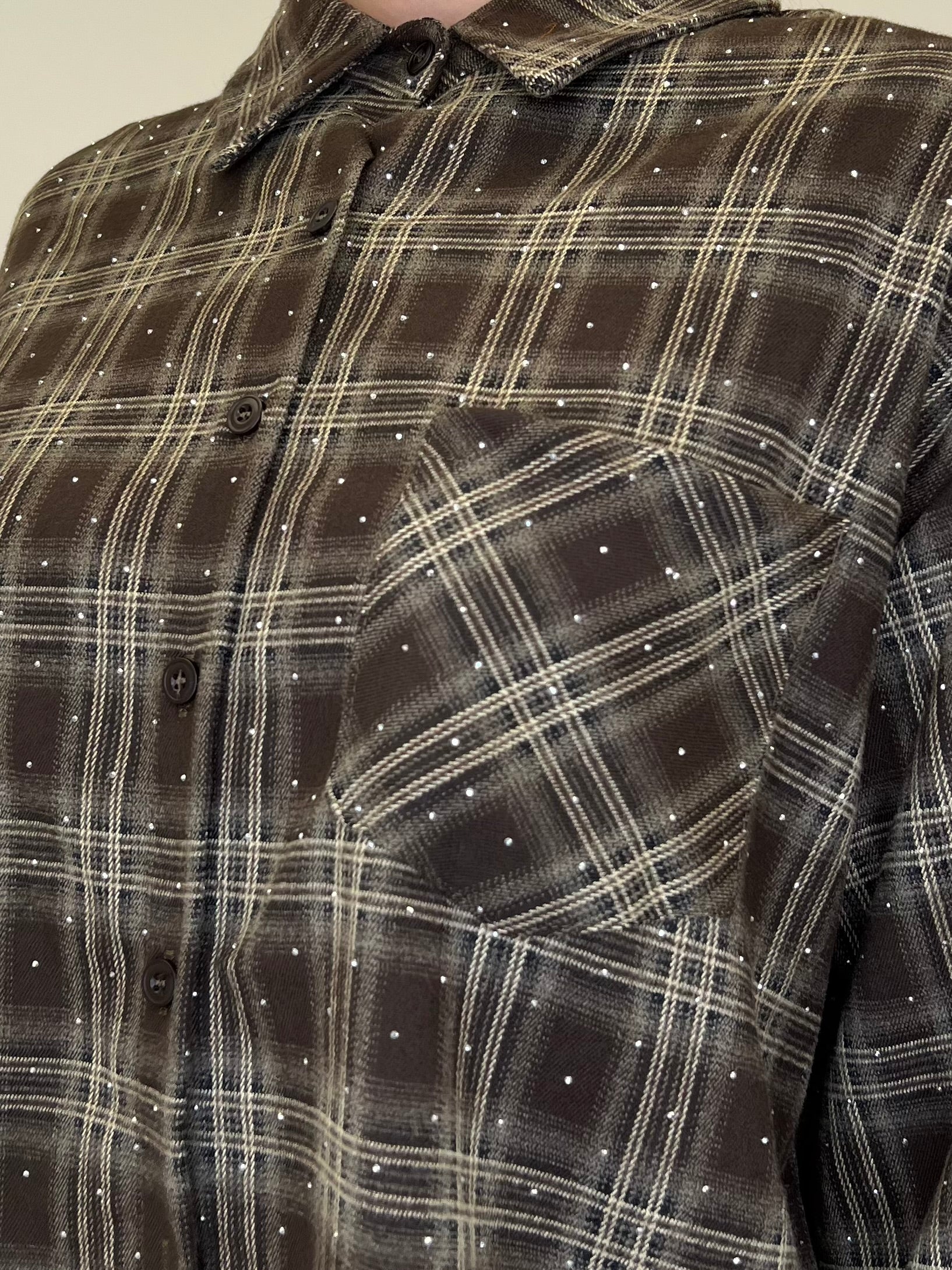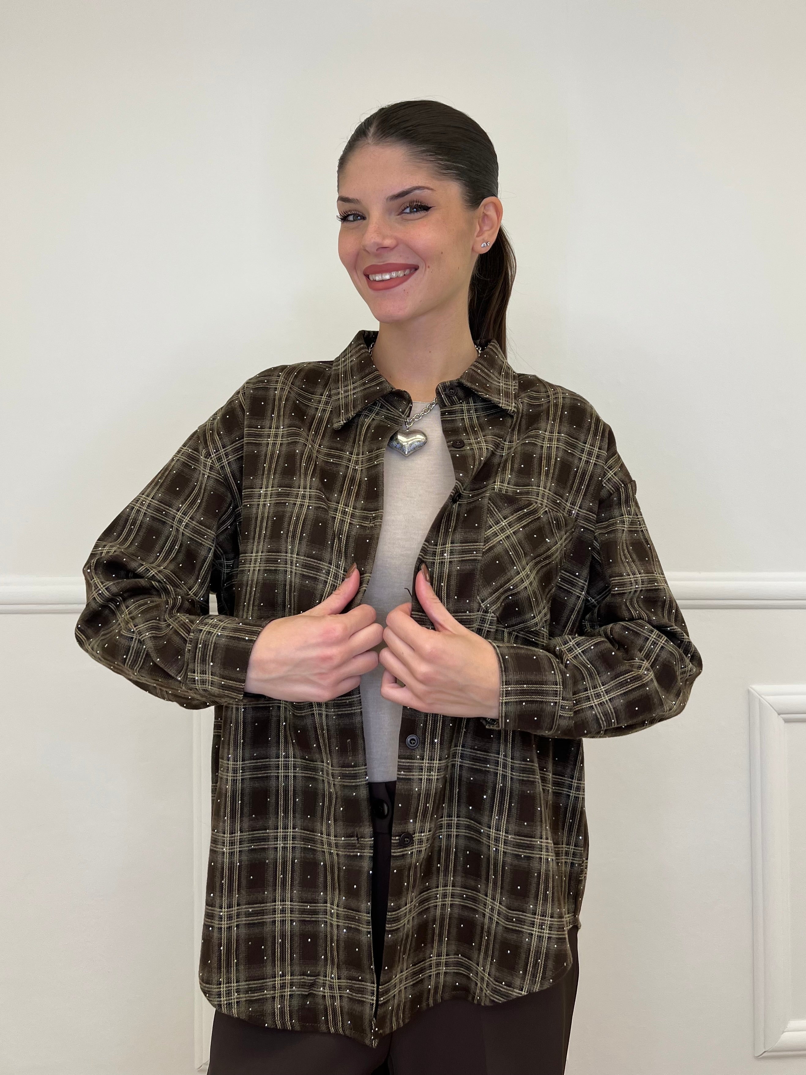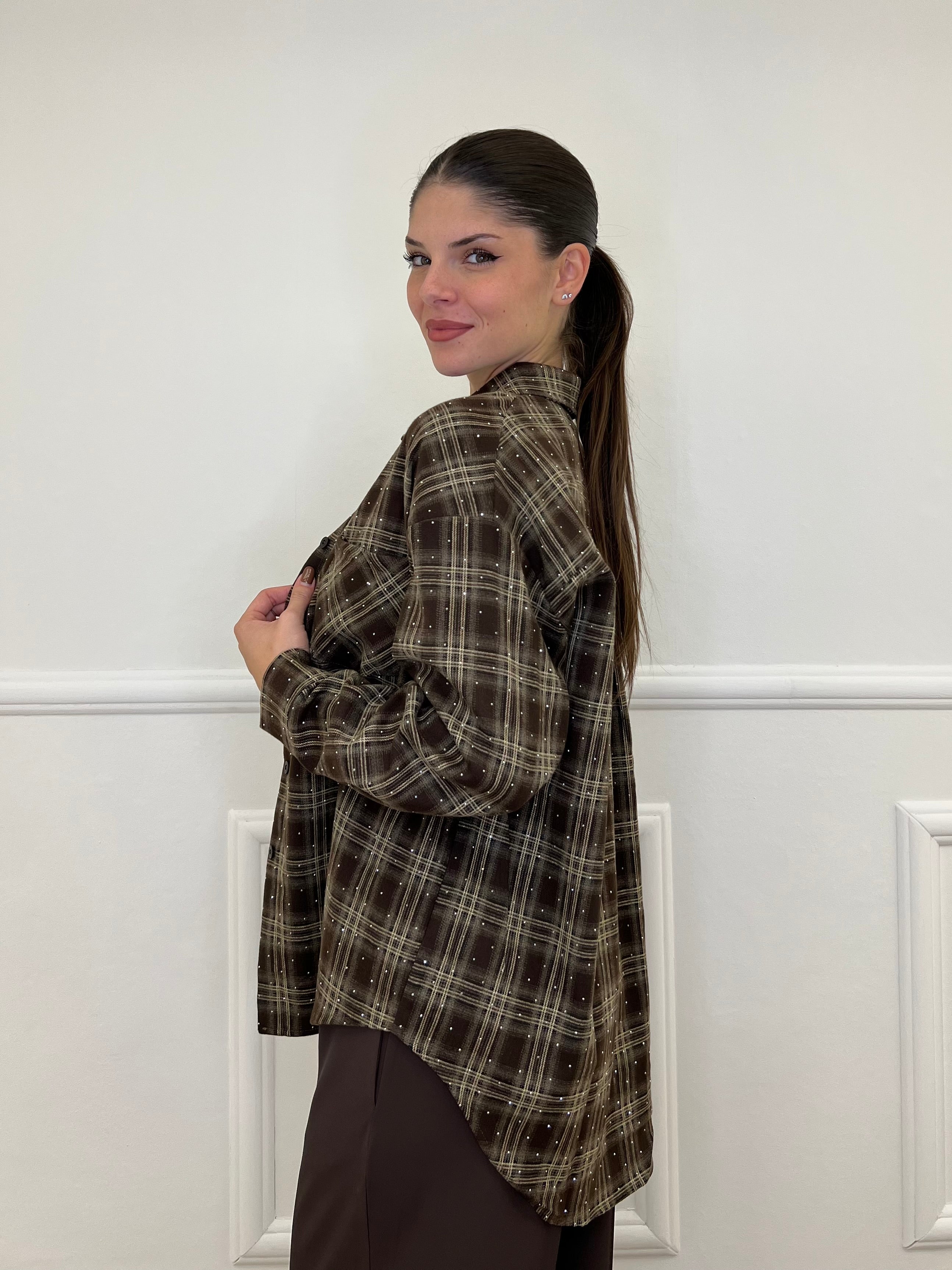 Camicia over in flanella di cotone madras con applicazioni micro strass e taschino frontale.