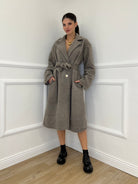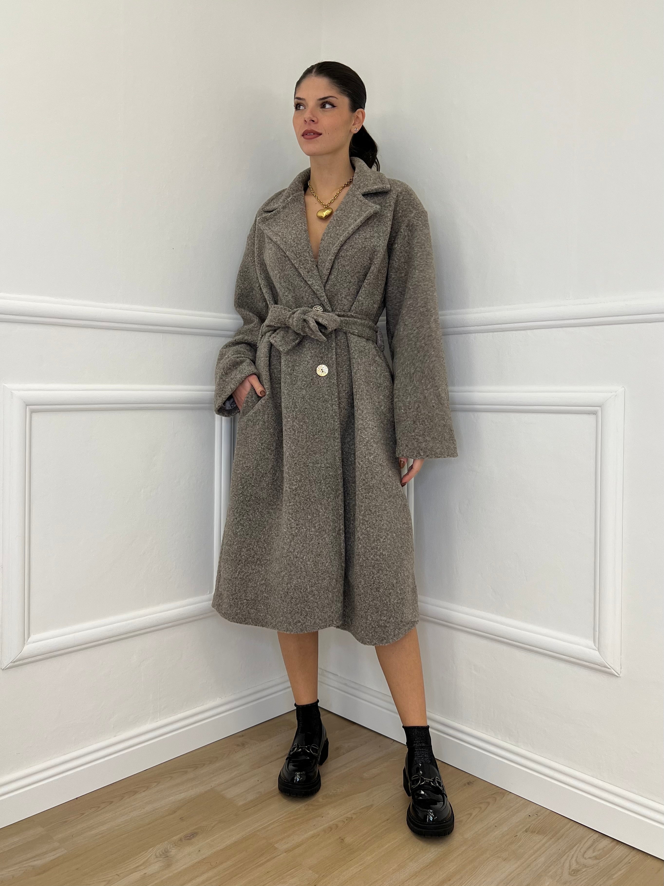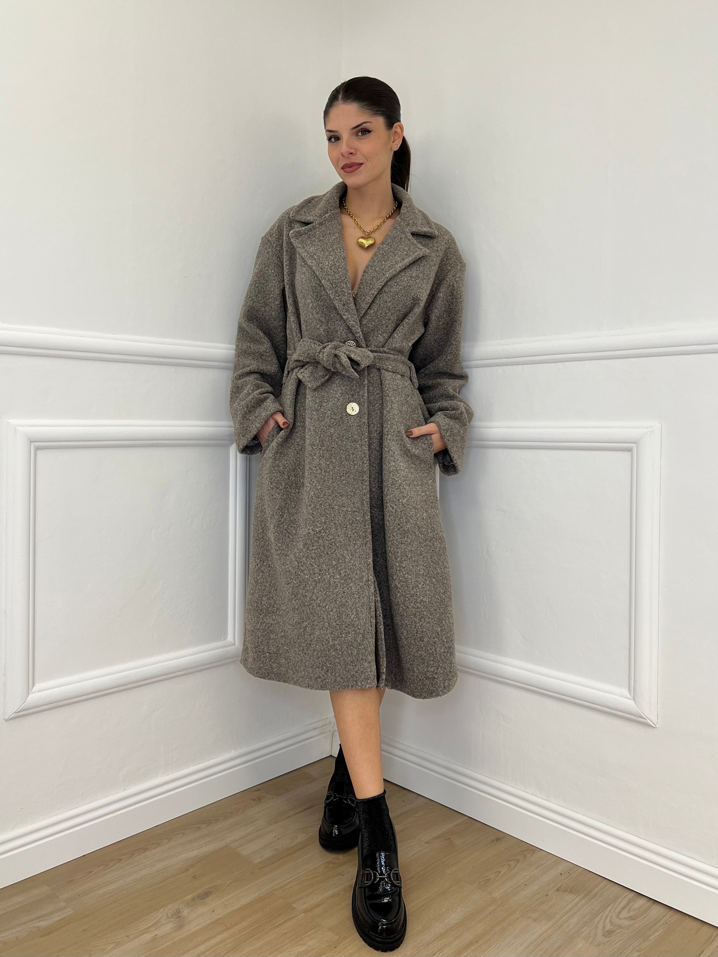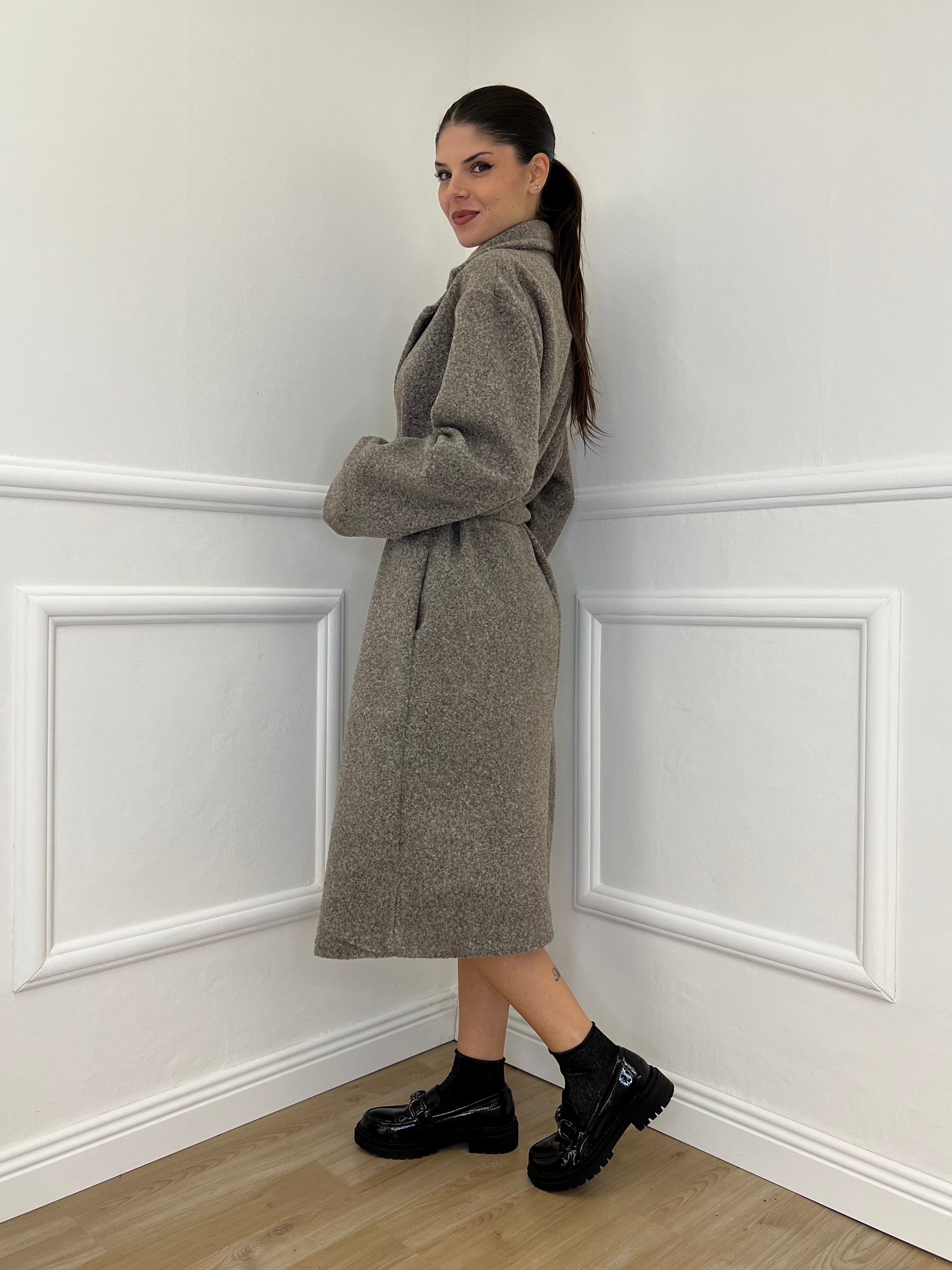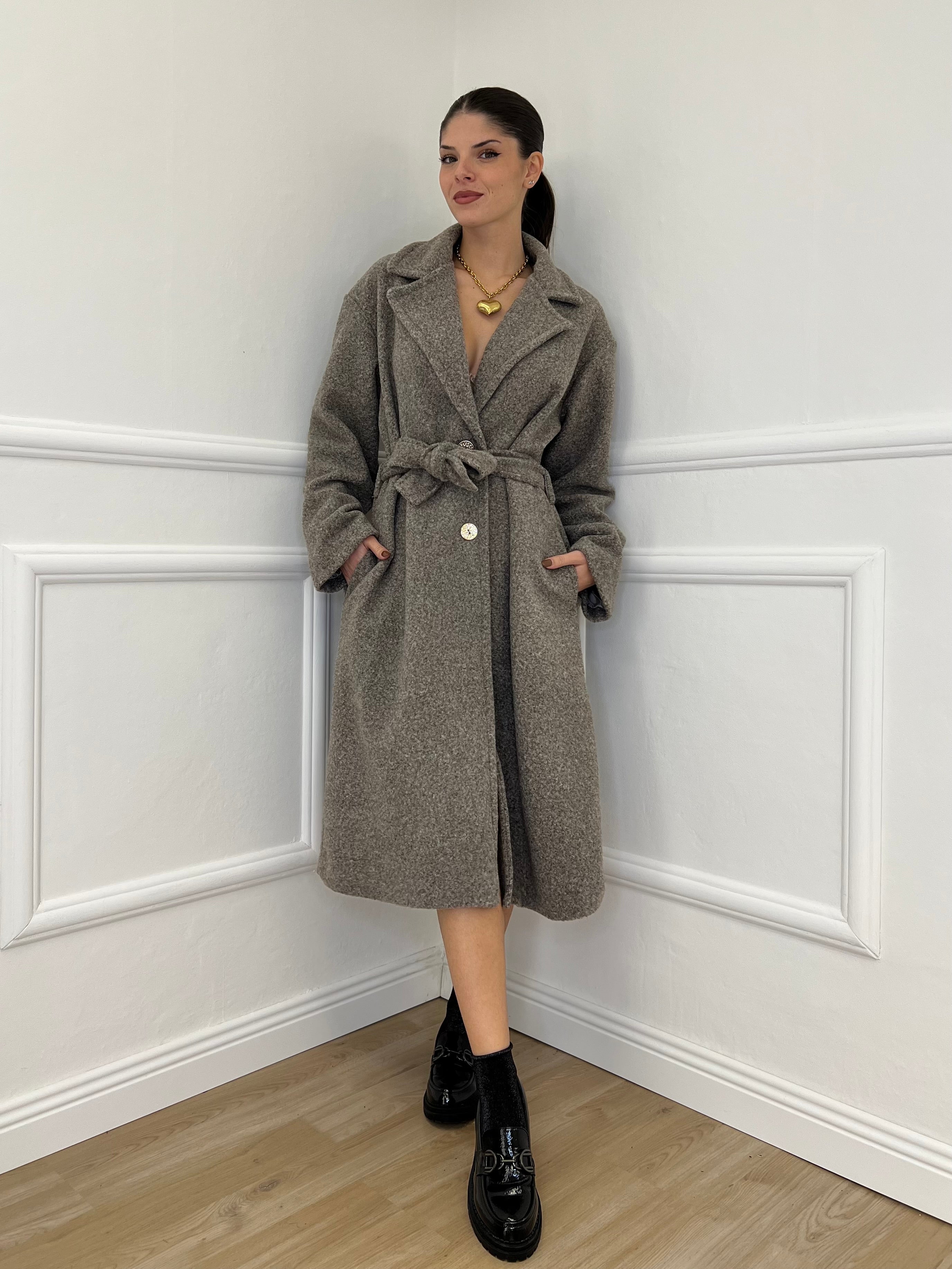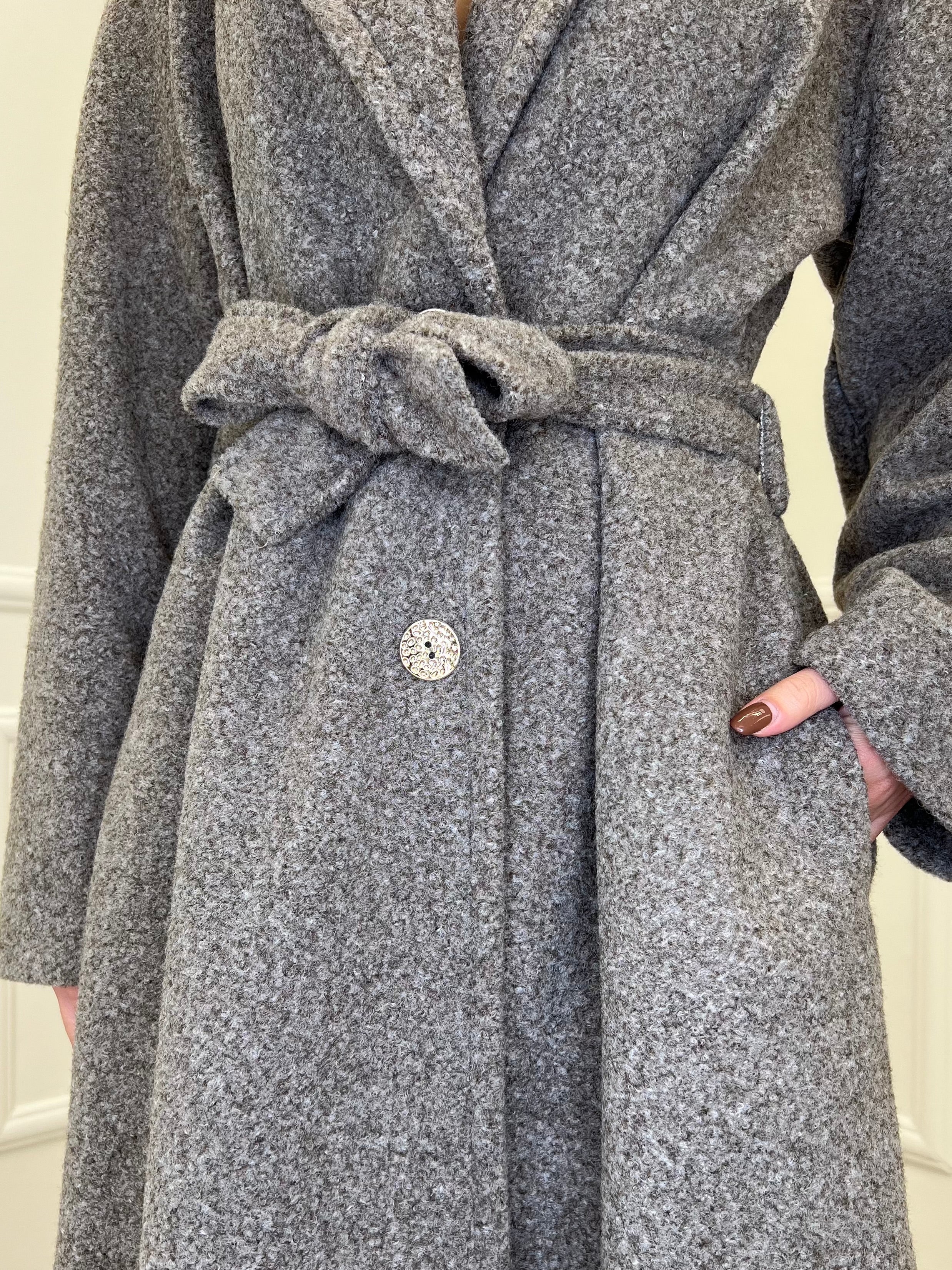 Cappotto monopetto foderato in boucle' con fusciacca rimovibile, tasche laterali e bottoni metallici operati.