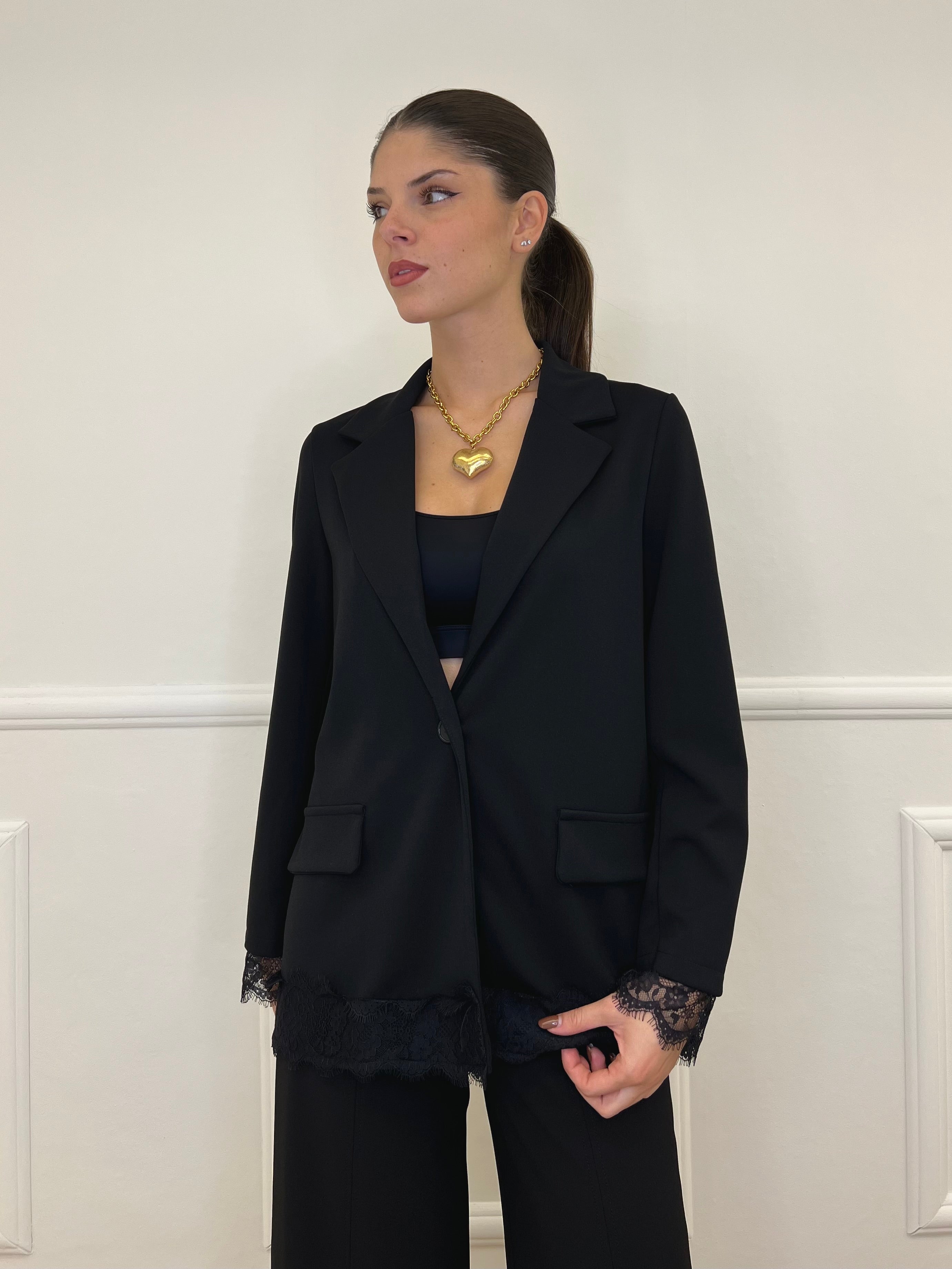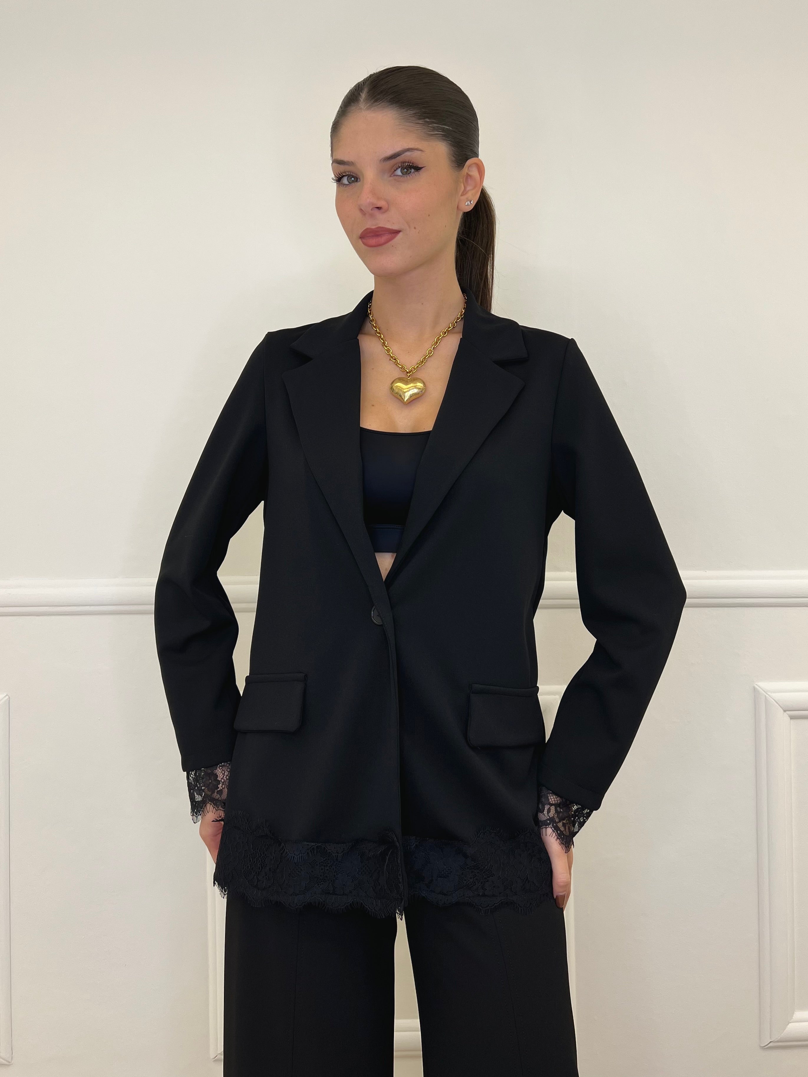 - Giacca monopetto sfoderata, regular fit con inserti in pizzo e finte tasche frontali;