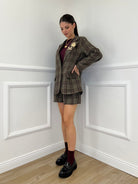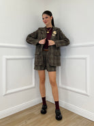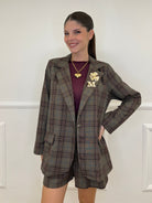 - Giacca over monopetto foderata con spalline rinforzate, finte tasche frontali, bottone operato e spille gioiello rimovibili;