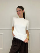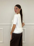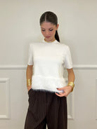 Maglia girocollo a maniche corte in misto viscosa elasticizzata con dettaglio maniche calate e fondo fluffy in eco pelliccia.