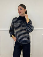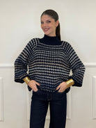 Maglia jacquard over, in misto lana e viscosa in punto "spina di pesce", con maniche raglan a 3/4 e collo a vulcano.