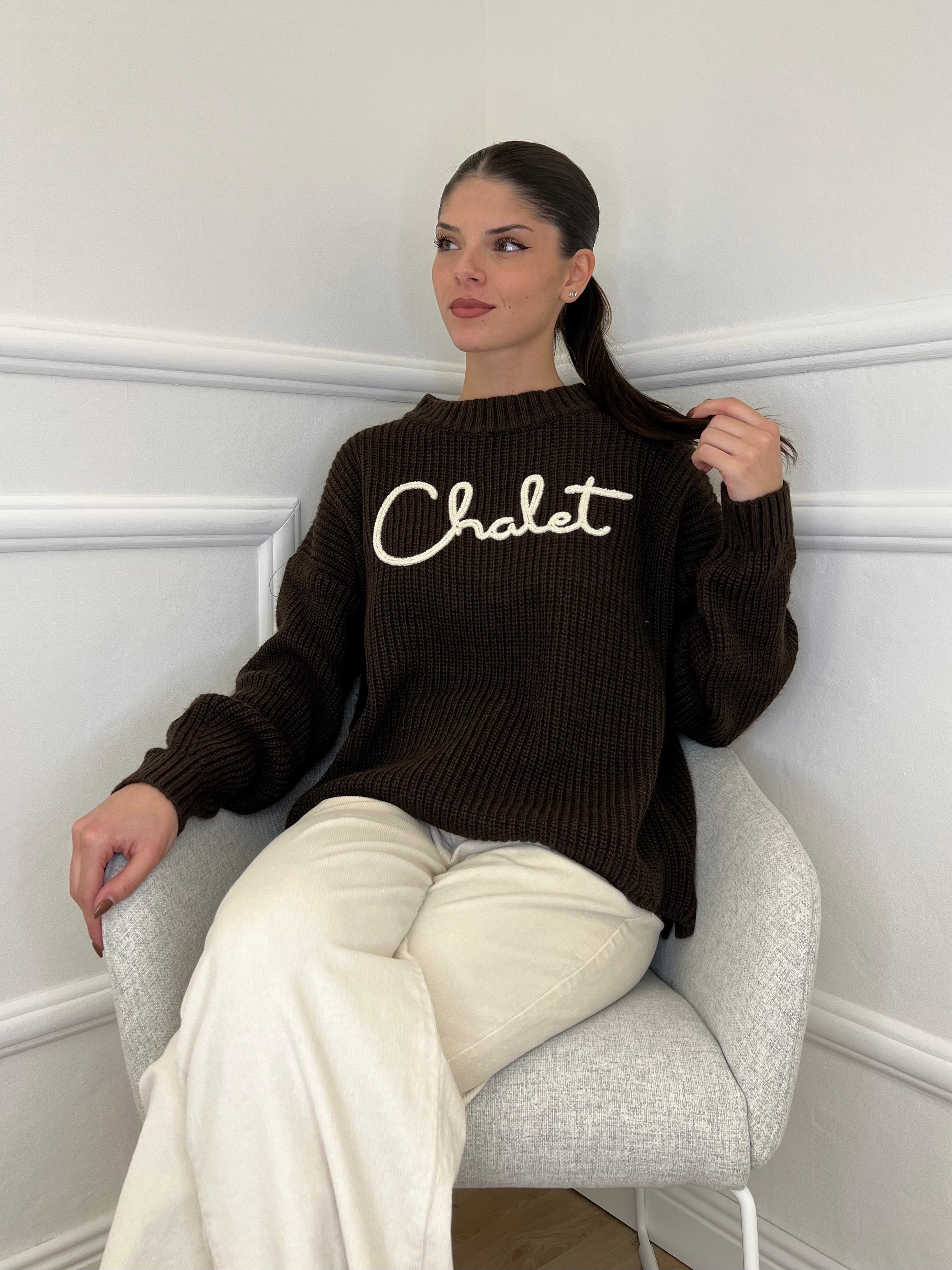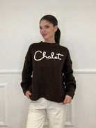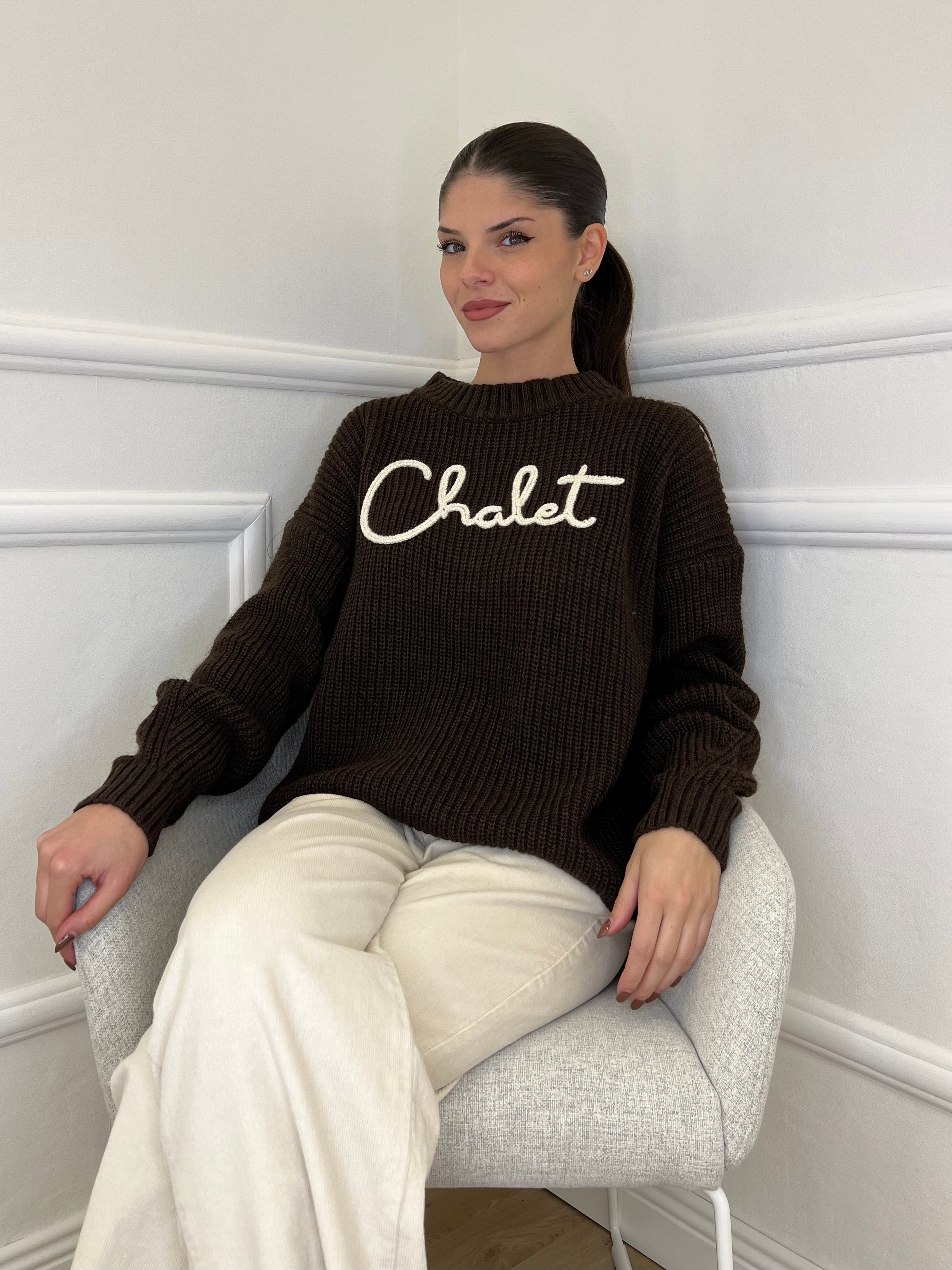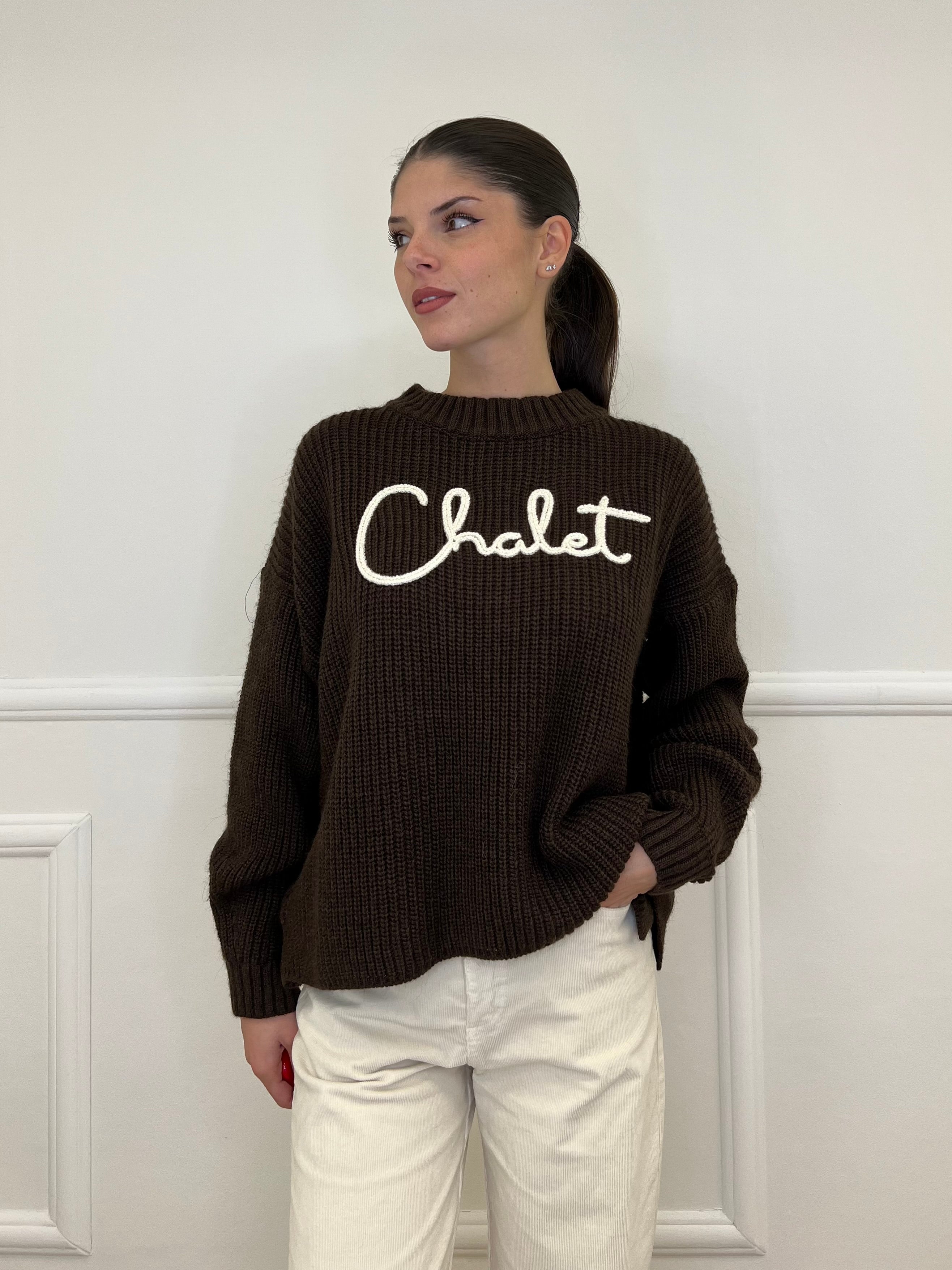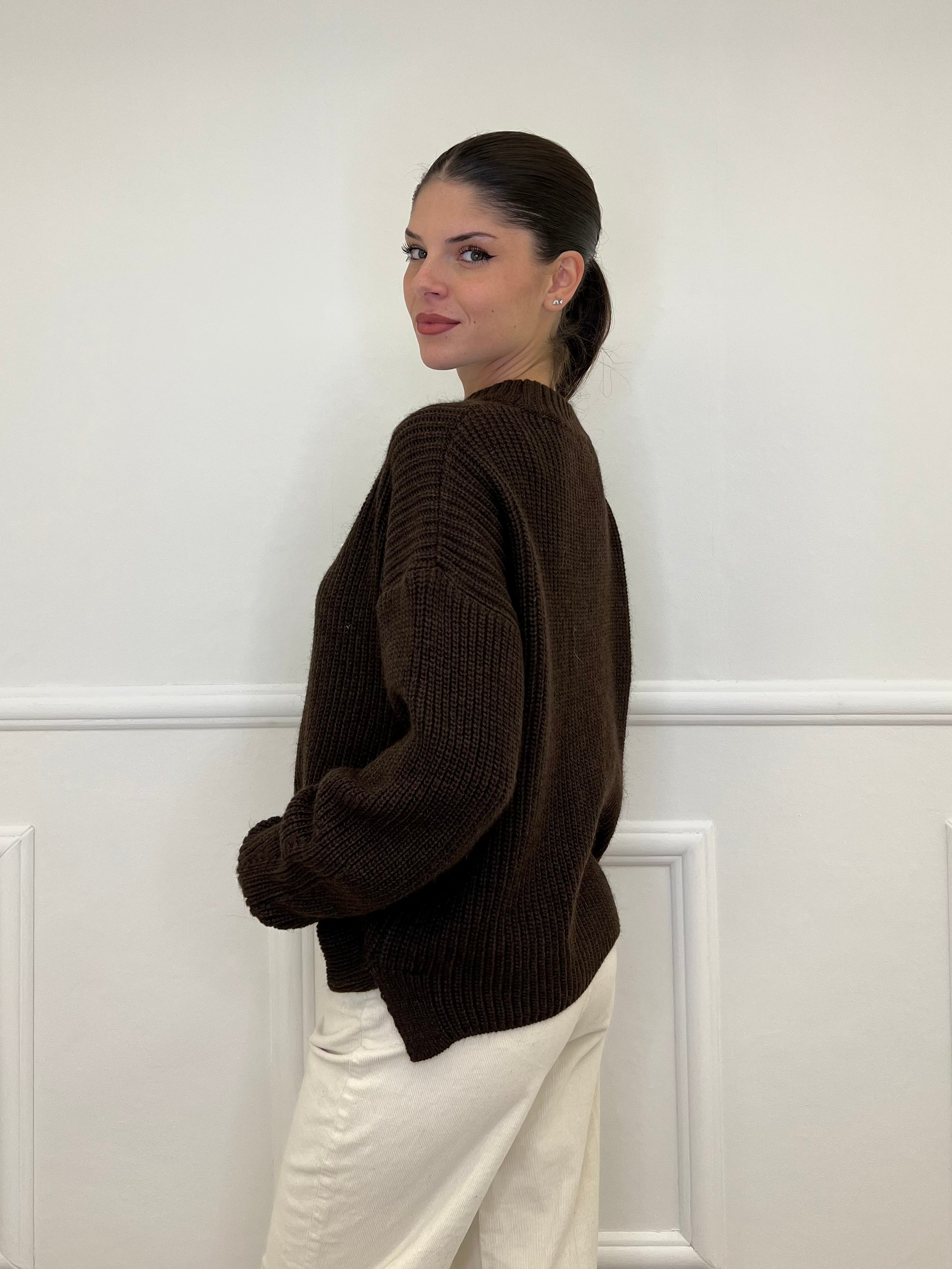 Maglia over a costa inglese in misto lana e alpaca a con profili rimagliati, spacchetti laterali e ricamo frontale a contrasto in rilievo.
