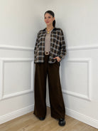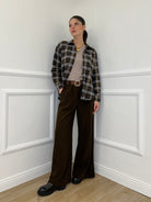 Pantalone a palazzo in velluto a coste elasticizzato, a vita medio alta, con tasche laterali, passanti e vita elastica.